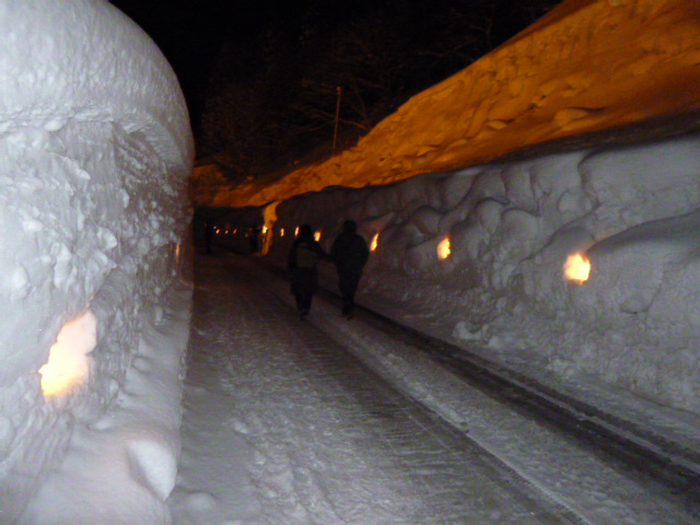 ”肘折幻想雪回廊”が始まります 雪壁に横穴を開け、そこにローソクの灯りを灯す”幻想雪回廊”が2月1日(土)から始まります。 雪国ならではの幻想的な風景が楽しめます(下記写真)。 2月1日(土)、8日(土)、9日(日)、15日(土)午後6時30分~20時まで点灯予定。 場所は温泉街の西側、天狗鼻橋を渡った所の道路、雪壁の両側に長さ100m位回廊が続きます。